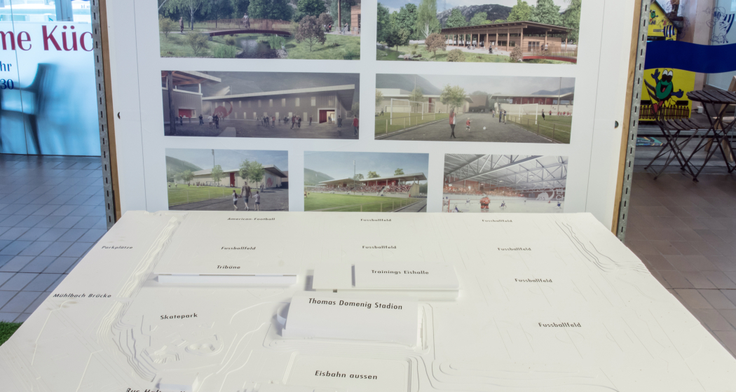 Wer im Sommer die Ausstellung zum Wettbewerb Rasen-/Eissport in der Rathaushalle verpasst hat, kann dies nun bis zur Abstimmung am 25. November in den Sportanlagen Chur noch nachholen. Im Eingangsbereich am Standort Obere Au wurde die Ausstellung für die Besucherinnen und Besucher eingerichtet. Gezeigt werden u.a. ein Modell des Siegerprojekts «Eisball» der Firma HRS Real Estate, zahlreiche Visualisierungen und Pläne der einzelnen, geplanten Anlagen und Informationen zum Masterplan Sport- und Eventanlagen Chur. Ein Touchscreen, der auf die Website www.obereau-2020.ch führt, ermöglicht es zudem, sich interaktiv sowohl über den Masterplan wie auch über das Projekt «Eisball» zu informieren. Ein neuer Tischfussball-Tisch von Rukka und ein Play Off Hockey Game von Stiga sorgen für Unterhaltung im Ausstellungsbereich.