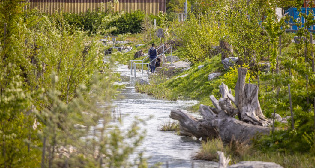 The renaturalised riverbed thus enables habitats for animals and a local recreation area for walkers and cyclists. The boccia and skate park are located right next to the inviting banks of the Mühlbach stream. Curved pedestrian bridges allow safe crossing of the stream and large concrete steps along the shore at the skate park invite you to linger.