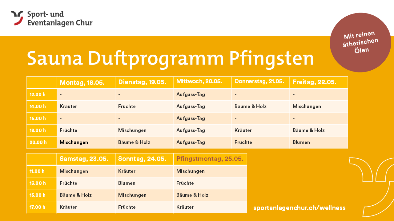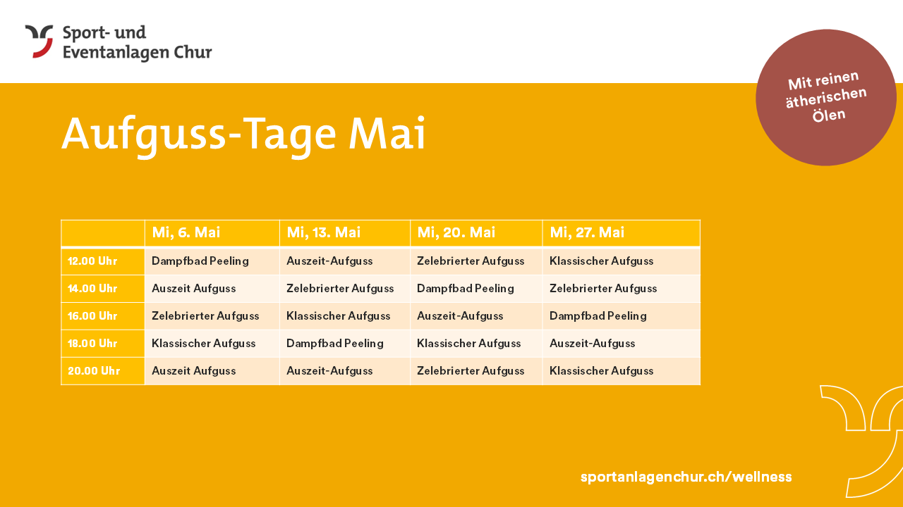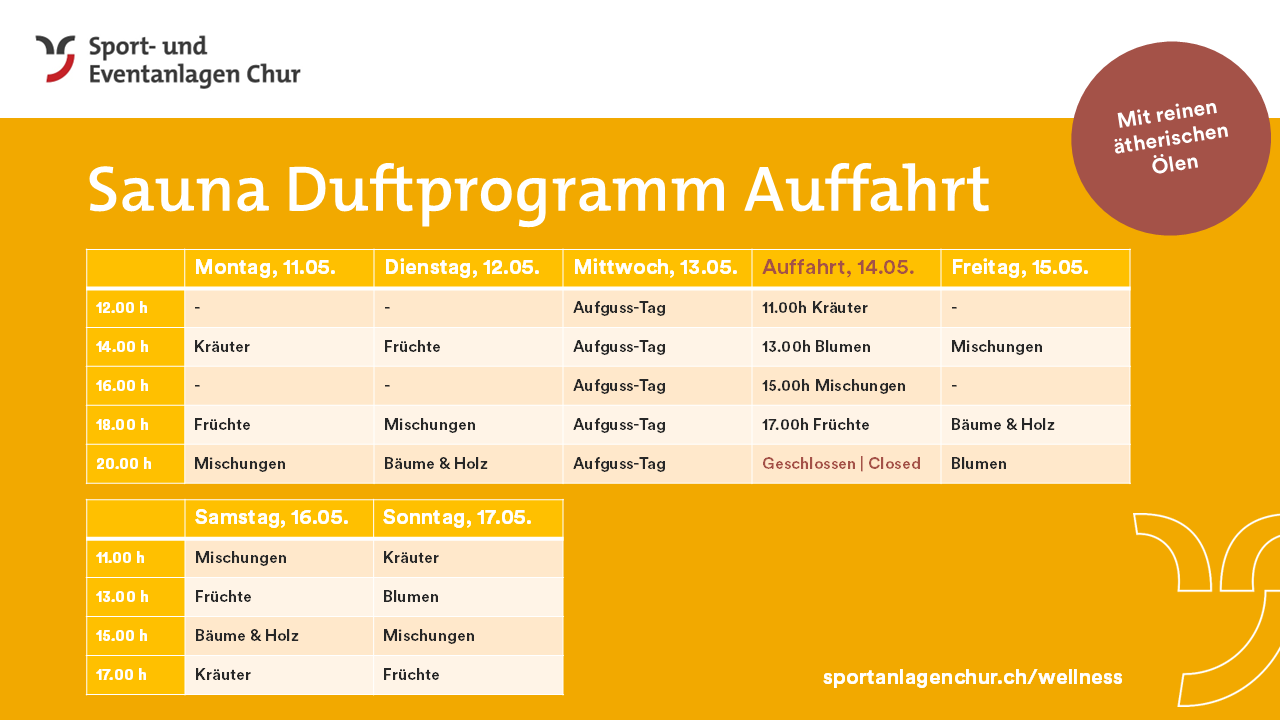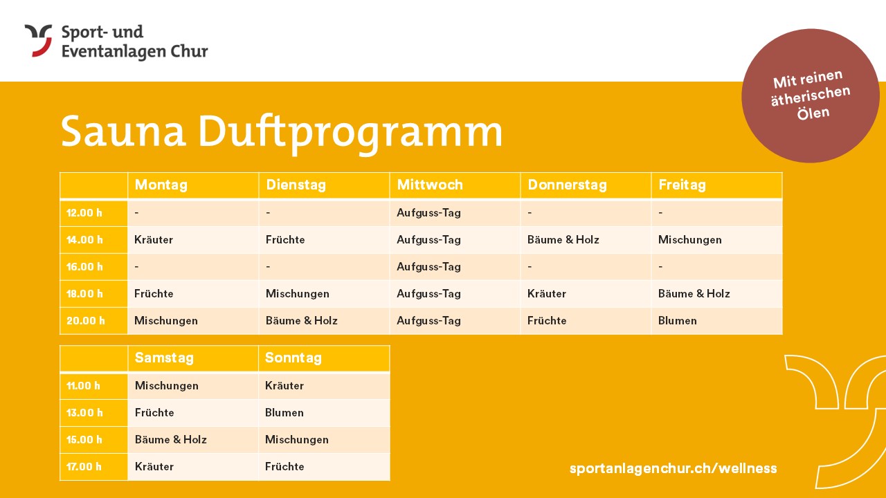 - Wednesday is Aufguss-day: from 12 noon every 2 hours, 3 harmonising oils are vaporised and distributed in the sauna by means of an Aufguss-ceremony.